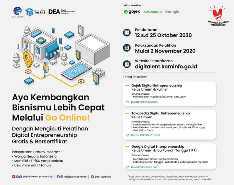 Jakarta, BISKOM – Kementerian Komunikasi dan Informatika (Kominfo) kembali menyelenggarakan Digital Entrepreneurship Academy (DEA) Digital Talent Scholarship 2020. Pelatihan digital yang ditujukan untuk warga negara Indonesia dan perempuan pelaku Usaha Mikro, Kecil, dan Menengah (UMKM) ini merupakan bagian dari dukung kepada Gerakan Bangga Buatan Indonesia (GBBI) serta menyiapkan talenta digital di bidang pemasaran agar kapasitas pelaku UMKM meningkat. Program ini bekerja sama dengan Gojek Indonesia, Tokopedia dan Google.