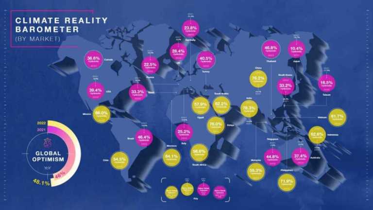 Namun, kekhawatiran iklim tidak mengarah pada pesimisme. Sebelum COP 26 pada November 2021, 46% responden global optimis bahwa bencana iklim dapat dihindari dalam seumur hidup. Saat dunia bersiap untuk COP27 di Mesir tahun ini, optimisme telah meningkat menjadi lebih dari 48%. Ini terjadi terlepas dari dampak perubahan iklim yang disaksikan selama setahun terakhir, menunjukkan ‘defisit realitas’ pada orang-orang yang berpotensi salah dalam memahami dampak perubahan iklim di masa depan untuk dunia.