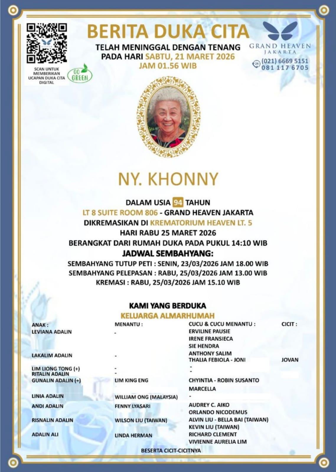 Kabar duka Khonny meninggal dunia usia 94 tahun ini menjadi momen refleksi atas perjalanan panjang kehidupan almarhumah, sekaligus pengingat akan pentingnya kebersamaan keluarga.