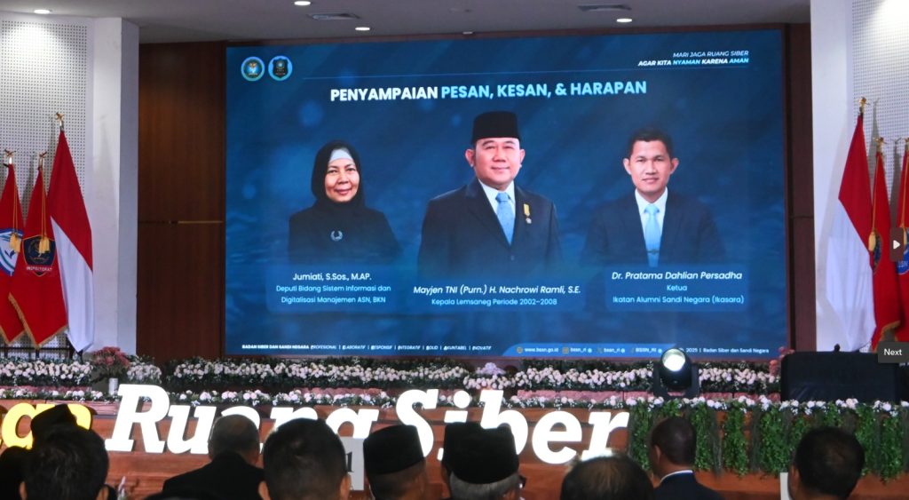 Dalam rangkaian kegiatan tersebut juga disampaikan pesan, kesan, dan harapan dari para tokoh dan pemangku kepentingan, di antaranya Mayjen TNI (Purn.) H. Nachrowi Ramli, S.E. (Kepala Lemsaneg Periode 2002–2008), Dr. Pratama Dahlian Persadha, S.S.T., M.T., CEH., CHFI. (Ketua Ikatan Alumni Sandi Negara – IKASARA), serta Jumiati, S.Sos., M.AP. (Deputi Bidang Sistem Informasi dan Digitalisasi Manajemen ASN, BKN). Penyampaian tersebut memberikan perspektif yang komprehensif mengenai pentingnya kesinambungan pembangunan keamanan siber nasional, baik dari sisi kebijakan, implementasi, maupun penguatan sumber daya manusia.