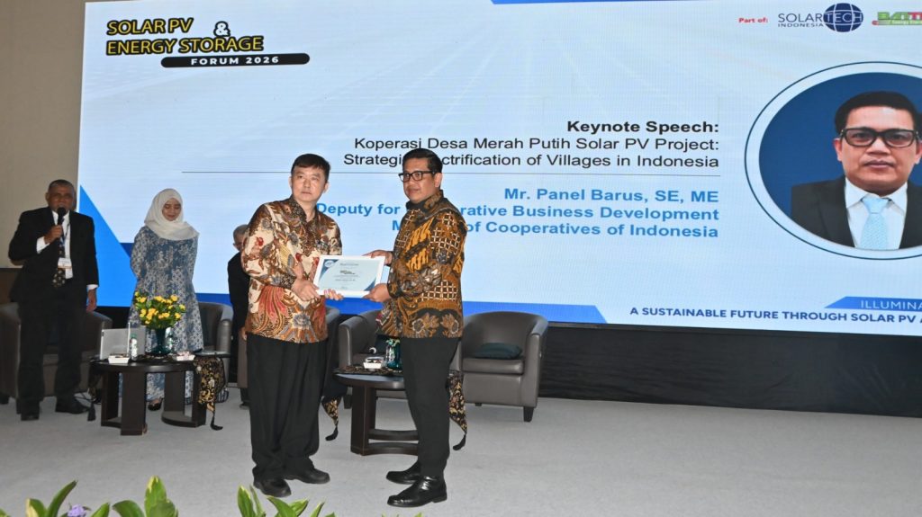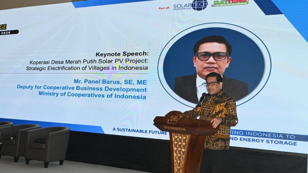 Dalam rangkaian acara Solar PV & Energy Storage Forum 2026, diselenggarakan pula sesi diskusi panel yang membahas “Koperasi Desa Merah Putih Solar PV Project: Strategic Electrification of Villages in Indonesia.” Sesi ini menghadirkan Keynote Speech yaitu Panel Barus, SE, ME , selaku Deputi Pengembangan Usaha Koperasi, Kementerian Koperasi Republik Indonesia. Beliau memaparkan strategi elektrifikasi desa berbasis koperasi sebagai salah satu pilar percepatan energi bersih di wilayah terpencil.